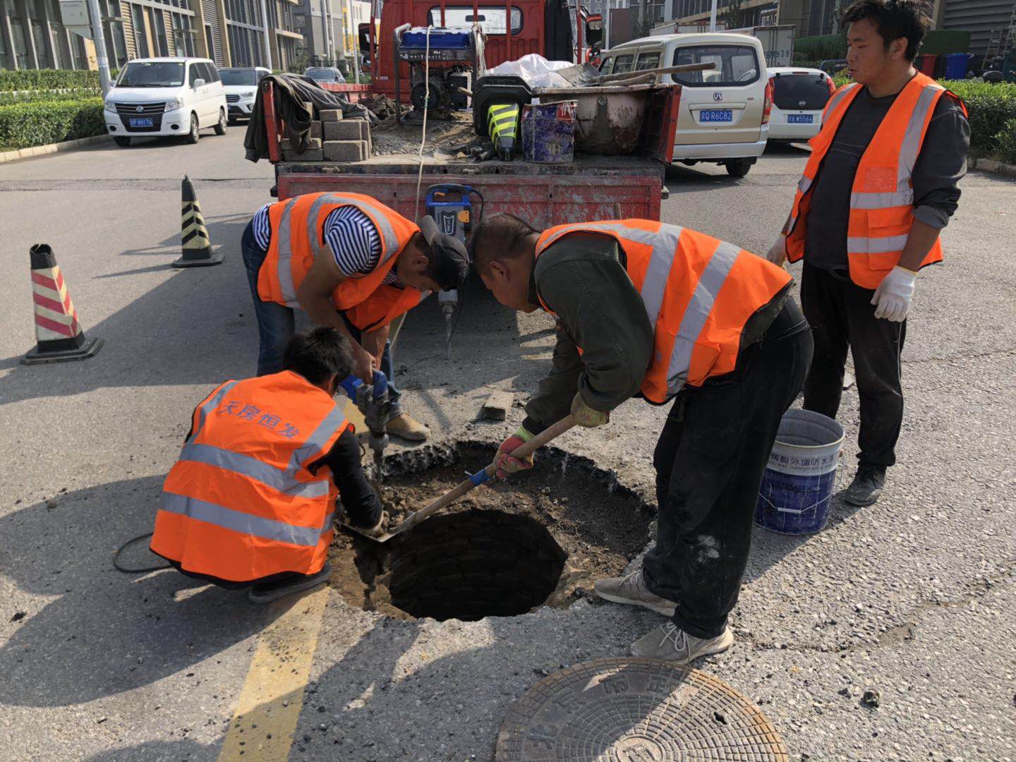 中秋节,大龙控股所属天房恒发的工程抢修队为国展周边道路进行市政维修